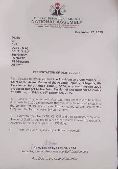 “The President and Commander-in-Chief of the Armed Forces of the Federal Republic of Nigeria, His Excellency, Bola Ahmed Tinubu, GCFR, is presenting the 2026 proposed Budget to the Joint Session of the National Assembly at 2:00 pm, on Friday, 19th December, 2025,” the letter read.